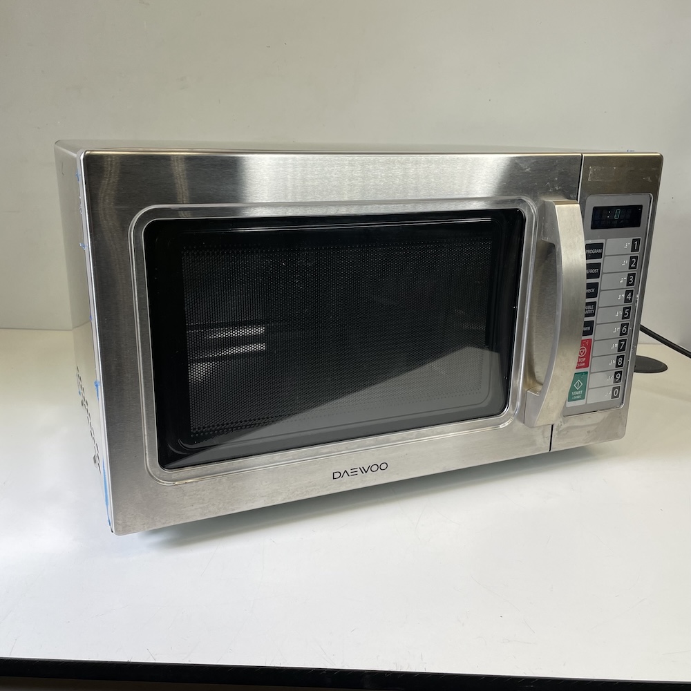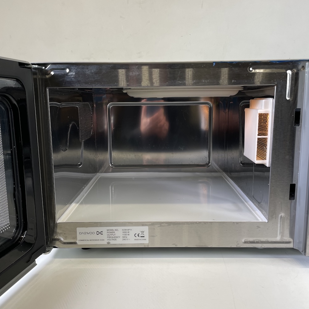 This is a top quality Daewoo commercial microwave oven. It comes supplied with a flat ceramic base interior (no turntable like domestic microwaves) and has an easy to use control panel. Very simple to use for reheating and with 20 memory programs
