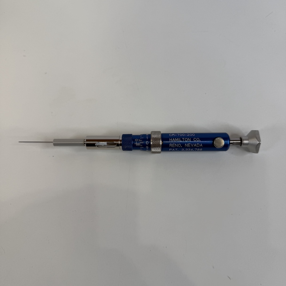 This CR700 Constant Rate syringe (PN: 84302) is a 200 uL volume syringe that offers reproducible constant flow dispensing via a push button. The volume is adjustable with a micrometer screw and can be fixed using a locked ring.