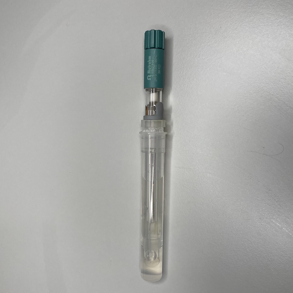 Combined pH electrode for aqueous acid/base titration. The fixed ground-joint diaphragm is insensitive to contamination. Reference electrolyte: c(KCl) = 3 mol/L, storage in storage solution.