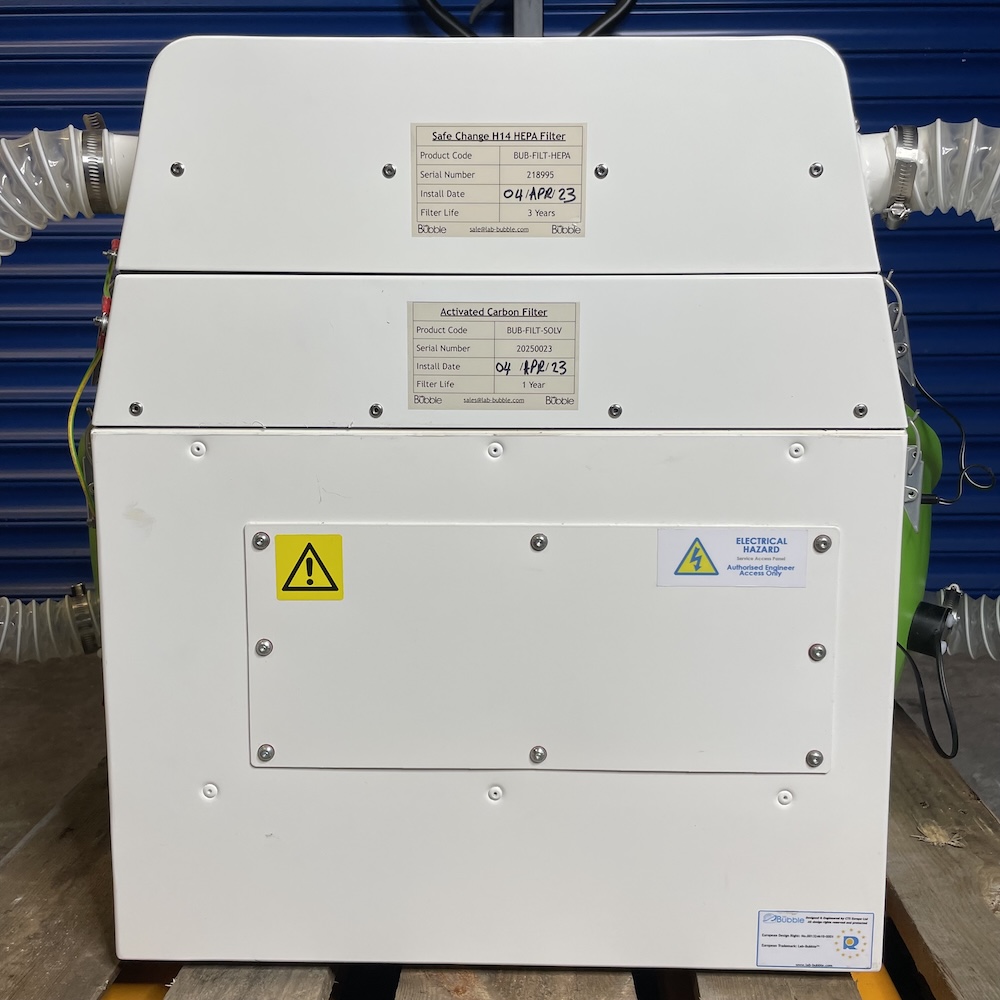 The Safety Bubble is a bench mounted fume hood system that performs to\recognised fume hood containment standards EN 14175 and BS 7989. This ensures protection for the user when handling hazardous chemicals. Laboratory air is drawn in through the front opening and carries airborne particulates and chemical vapours away from the user. Airborne contaminants are captured in a specially designed safe change filtration module. Clean air is then exhausted safely back into the laboratory saving on energy and facility costs.